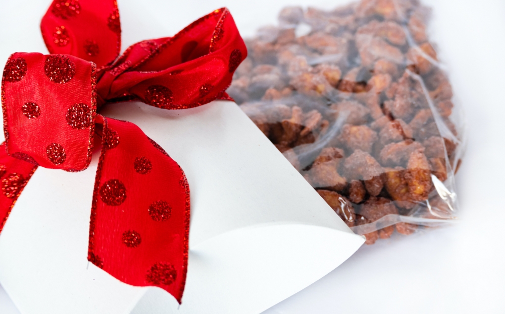 12 oz. of our fresh cinnamon glazed almonds. Sealed in a polybag and placed in a white pillow gift box with a bow. The perfect gift for any occasion!