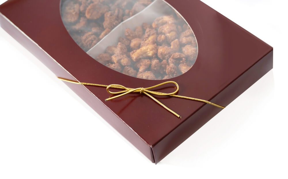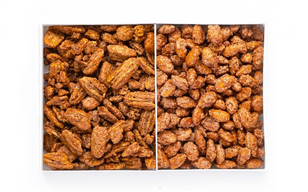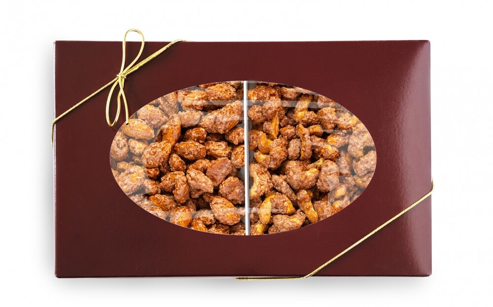 Our Burgundy gift box includes two of our deliciously flavored nuts of your choice. Your first choice may include 8 oz of any of our 3 classic cinnamon glazed nuts, and your second choice may include 8oz of either our 3 classic cinnamon glazed nuts or one of our 2-holiday exclusive nuts (chocolate covered almonds or toffee chocolate almonds). All gift boxes are roasted fresh and sealed in the box for maximum freshness.