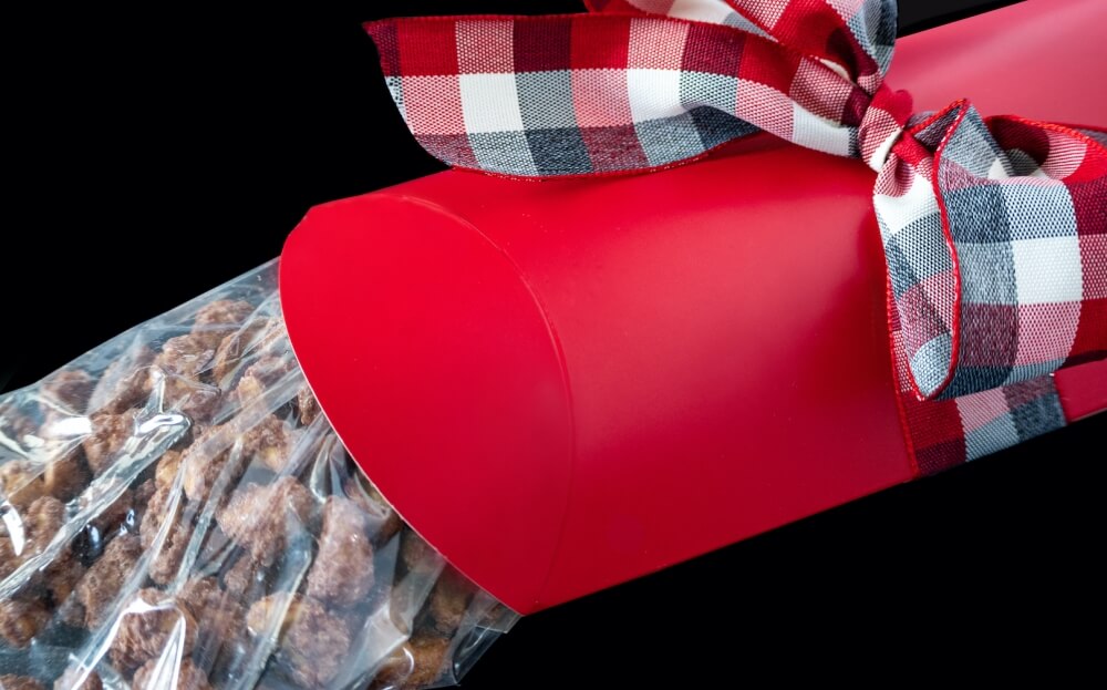 8 oz. of our fresh cinnamon glazed cashews. Sealed in a polybag and placed in a red pillow gift box with a bow. The perfect gift for any occasion!