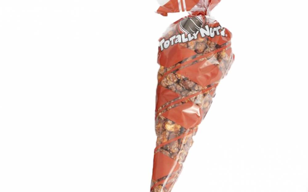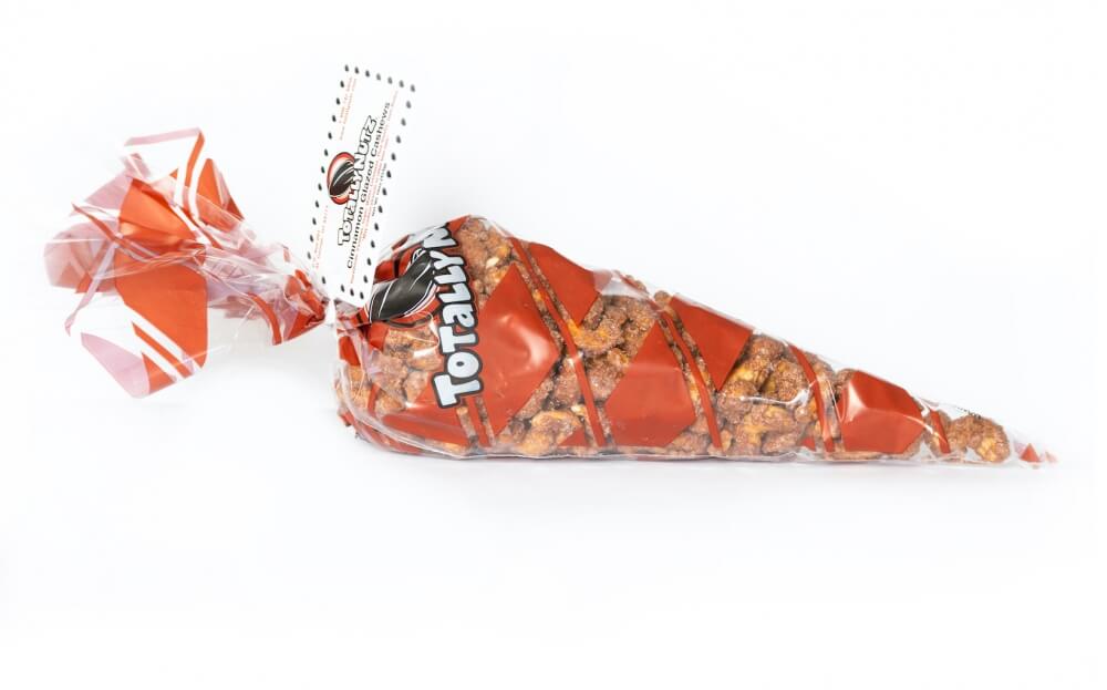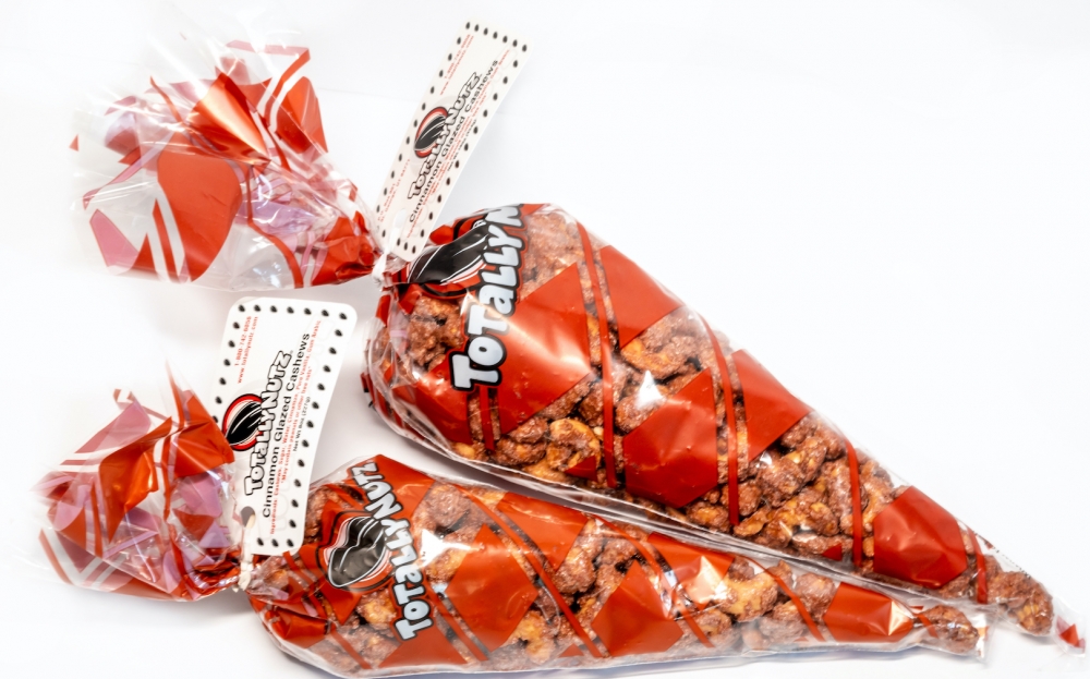 16 oz. of our fresh cinnamon glazed cashews in a poly cone bag.