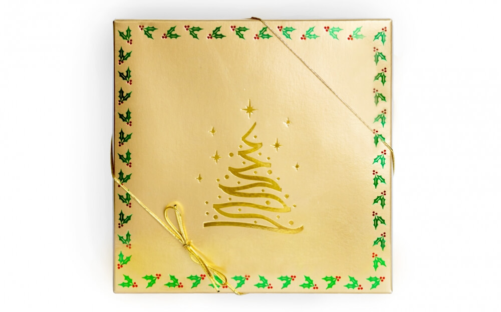 The perfect Holiday gift: our beautiful 4-part Starlight Tree Box. This box features a beautifully embossed gold tree surrounded by stars in the center. The outer border of the box is embossed with small green and red holly. The box is tied with a gold elastic bow and has a black box bottom.
